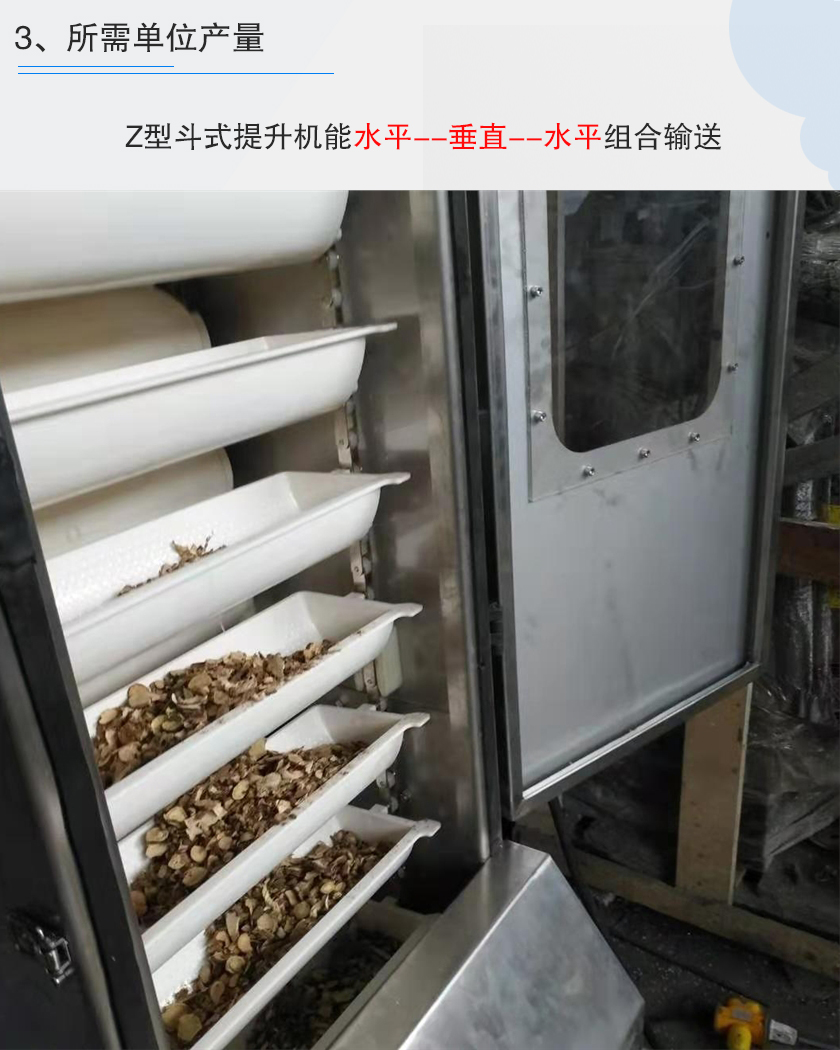 z型斗式提升機能水平--垂直--水平組合輸送,對于不同的提升高度,選擇的z型斗式提升機型號是不一樣的,提升的高度越高,其驅(qū)動力就雨大,在選擇時需要注意這一事項。