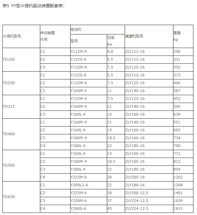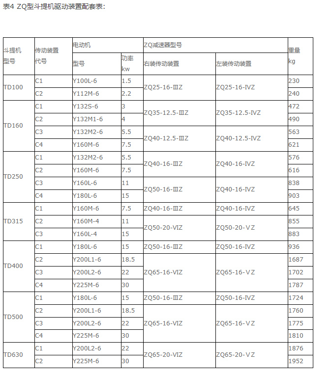 TD型斗式提升機(jī)結(jié)構(gòu)形式:傳動(dòng)裝置TD型斗提升機(jī)的傳動(dòng)裝置有兩種形式分別配有YZ型減速器ZQ(或YY)型減速器。YZ型軸減速器直接裝在主軸軸頭上,省去了傳動(dòng)平臺(tái)、聯(lián)軸器等,使結(jié)構(gòu)緊湊、重量輕,而且其內(nèi)部帶有異型輥逆止器,逆止可靠。該減速器噪音低,運(yùn)轉(zhuǎn)平穩(wěn),并隨主軸浮動(dòng),可消除安裝應(yīng)力。