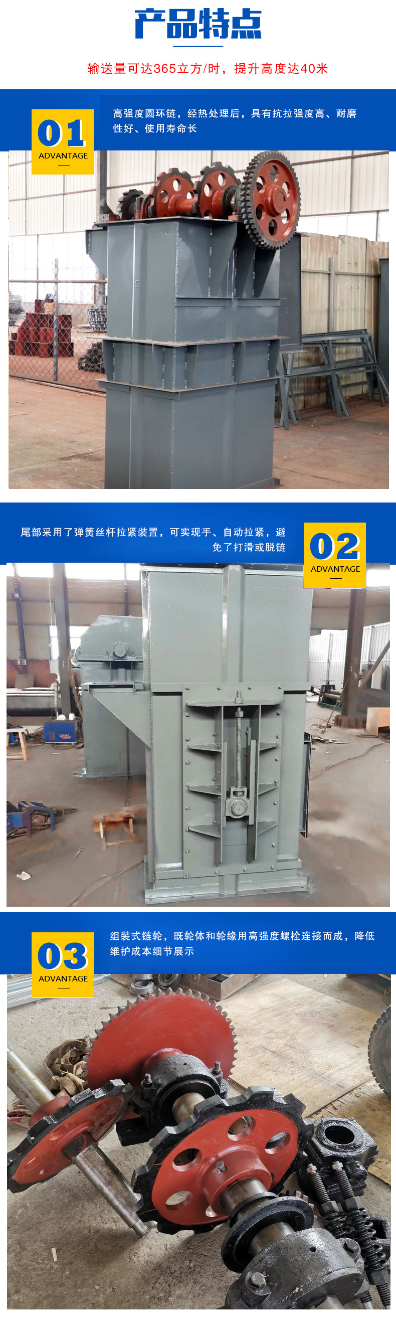 環(huán)鏈斗式提升機適用于垂直輸送磨琢性較大的粉狀、粒狀、及小塊狀物料,如糧食、煤、水泥、碎礦石等,輸送高度高40m,其特點為,結構簡單,運行平穩(wěn),掏取式裝料,混合式或重力卸料,輪緣采用組合鏈輪,更換方便,鏈輪輪緣經特殊處理壽命長,下部如采用重力自動張緊裝置,能保持恒定的張力,避免打滑或脫鏈,同時在料斗遇阻時,有一定的容讓性能夠有效地保護運動部件,物料溫度不超過250℃。