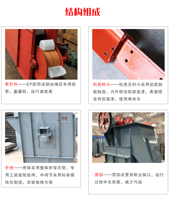 斗式提升機由上部區(qū)段、中部機殼、下部區(qū)段、帶料斗的輸送帶等牽引部件、傳動裝置和室外檢修平臺組成。